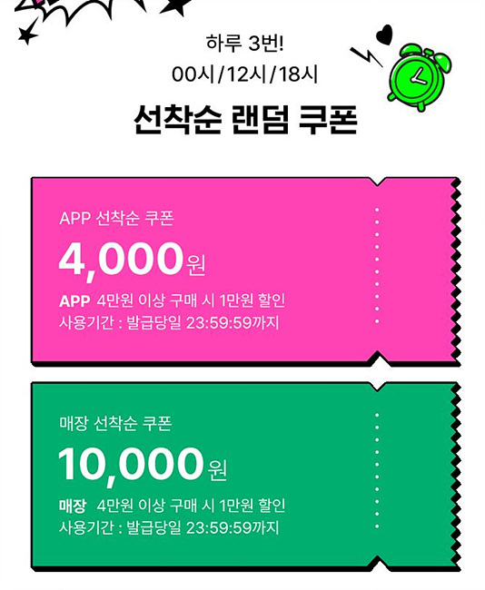 - ‘선착순 쿠폰’: 매일 오전 0시, 낮 12시, 오후 6시에 선착순으로 발급되는 최대 1만원 할인 쿠폰
