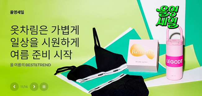 - ‘브랜드 데이 특가’: 매일 1~2개 브랜드가 선정되어 대표 상품이 추가 할인!